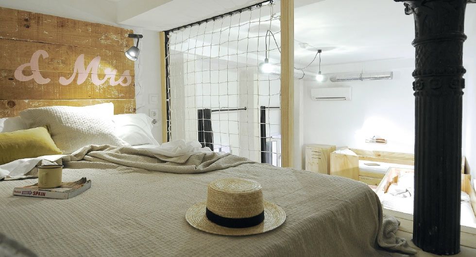 Tras la fachada de este palacete decimonónico, remodelado completamente por el estudio de arquitectos Jesús Manzanares, The Hat apuesta por una decoración cosmopolita, orgánica y con un punto ecléctico obra del estudio de interiorismo Aaprile. Esto lo consigue gracias a un mobiliario de madera de pino diseñado y realizado ad hoc en una pequeña fábrica de muebles de la localidad de San Pablo de Los Montes (Toledo), que convive en perfecta sintonía con antiguas columnas forja, elementos decorativos vintage como su gran baúl rojo y plantas que aportan vida al espacio. Todo ello salpicado de pequeñas dosis de atrevimiento como la cadena de macetas que cuelgan por las habitaciones de su patio interior a modo de jardín vertical o la gran rueda de molino que preside el ático. Sin duda, una decoración que no deja indiferente. Y a ello también contribuye Yembara, el ilustrador que se ha encargado de realizar a mano toda la señalética del hotel y los diferentes murales pintados sobre sus paredes como el del hall en el que reza el lema: “Wherever I Lay My Hat That’s My Home”.