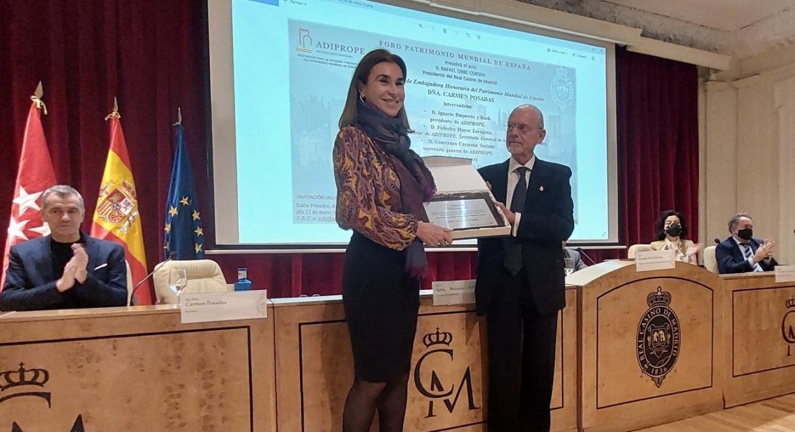 En ese acto, en el que participaron diferentes miembros de ADIPROPE, se nombró a la escritora Carmen Posadas como Embajadora Honoraria del Patrimonio Mundial de España, cuyo título correspondiente le entregó el presidente de ADIPROPE Ignacio Buqueras. Carmen Posadas, que el pasado año consiguió que su novela La leyenda de La Peregrina fuera una de las novelas históricas más vendidas, hizo referencia a las dos intervenciones anteriores sobre el español, que es hablado en Estados Unidos por más de 40 millones de personas y sobre la importancia del Patrimonio que hace que España sea el tercer país con más registros (49 en total), sólo por detrás de China e Italia.