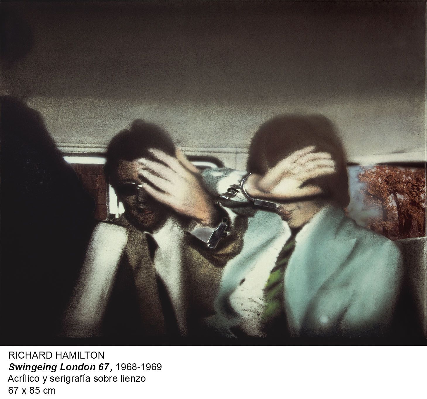El título de esta polémica serie fotográfica-pictórica, Swingeing London 67, hace referencia a un término que se aplica a la escena de la moda y la cultura florecida en Londres en la década de los sesenta. La imagen, más que una protesta contra la acción de la justicia puede entenderse como una reflexión sobre las vicisitudes de la celebridad. En este contexto, Hamilton decidió hacer estudios de prueba y bocetos en lienzo, hacia una fusión ideal de impresión y pintura. En cada pintura de la serie, el artista emplea técnicas y materiales diferentes: pintura al óleo, pintura al esmalte, serigrafía a mediatinta, relieve y collage.