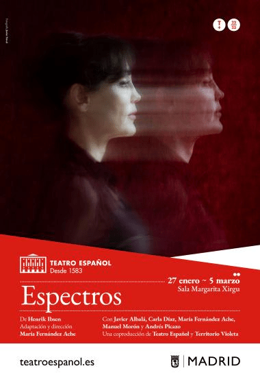 Espectros es una producción de Teatro Español, Territorio Violeta y Philippe Nadouce con texto de Henrik Ibsen, adaptada y dirigida por María Fernández Ache, protagonizada por la propia Fernández Ache junto a Javier Albalá, Carla Díaz, Manuel Morón y Andrés Picazo, con diseño de espacio escénico y vestuario de Ikerne Giménez, diseño de iluminación de Felipe Ramos y diseño de sonido de Nacho Bilbao.