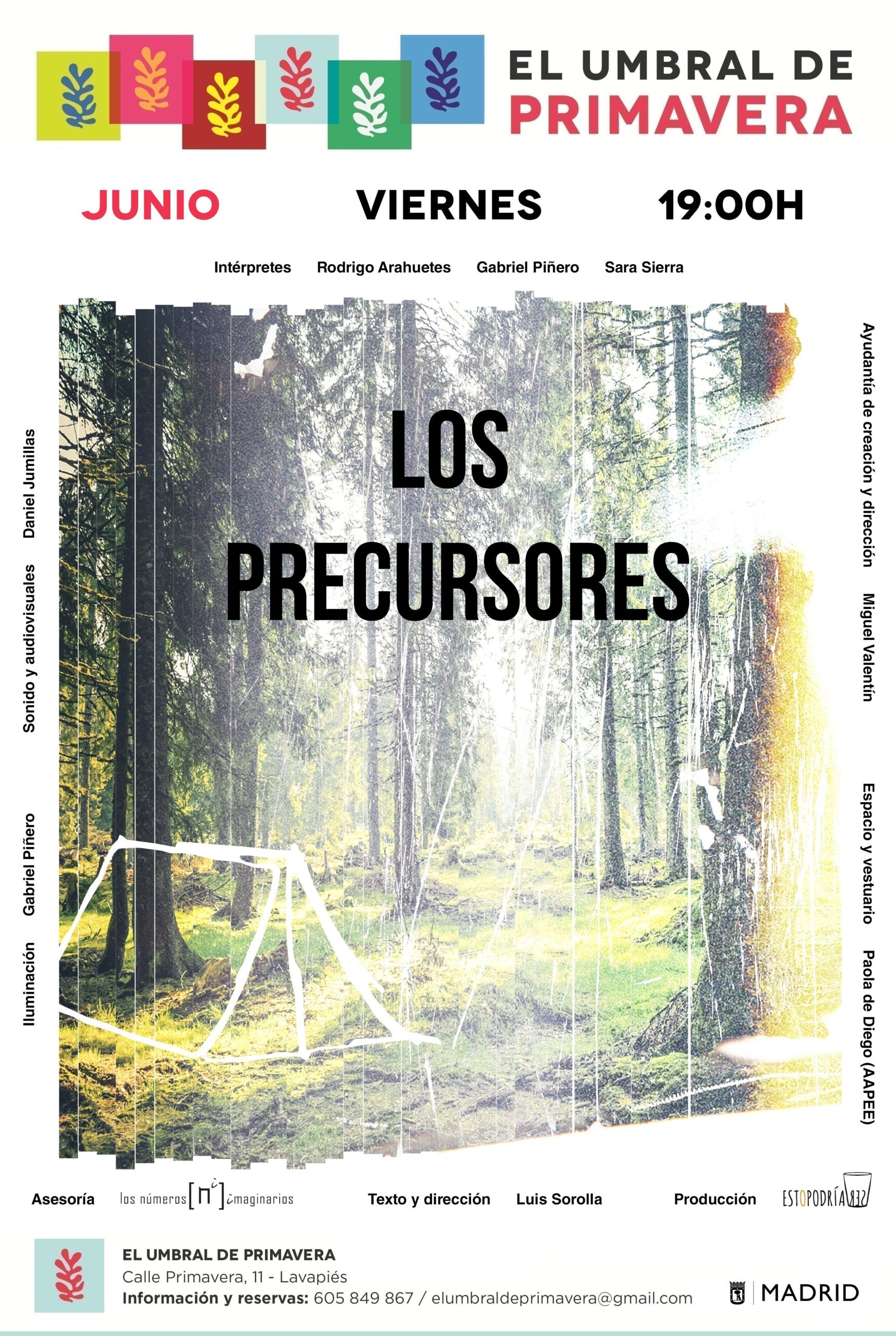 Los precursores vuelve a la cartelera madrileña todos los viernes de junio con el trabajo de Miguel Valentín como ayudante de creación y dirección, Paola de Diego en escenografía y vestuario, Daniel Jumillas en sonido, Gabriel Piñero en iluminación y Luz Soria en fotografía y la asesoría de [los números imaginarios]. Es la cuarta producción de Esto Podría Ser, productora fundada por Luis Sorolla en 2018 especializada en piezas de creación propia.