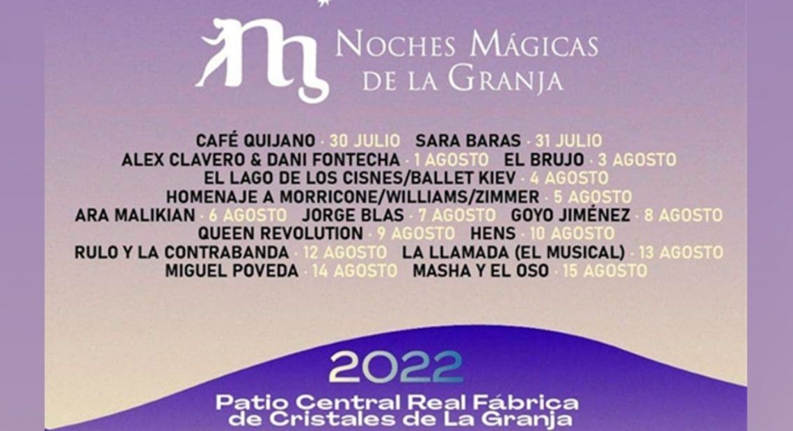 Tras años de espera vuelven a ser mágicas las noches de la Granja de San Ildefonso con una programación artística variada y de altísima calidad que pasa por la música, el ballet y el baile flamenco, entretenimiento para los más pequeños y magia. Durante 15 noches el patio de la Fábrica de Cristales dará la bienvenida a las Noches Mágicas, dejándose atrás el calor del día y disfrutando del arte en compañía.