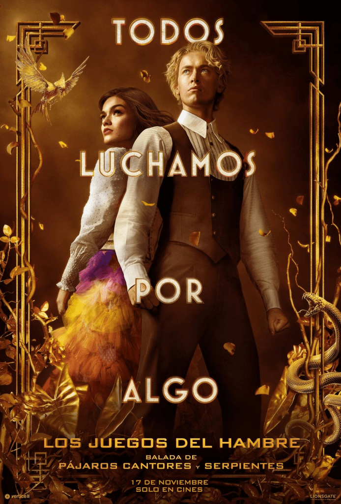 Dividida en partes, al igual que el libro, esta adaptación cinematográfica tiene como protagonistas a Rachel Zegler (quien interpreta con exactitud a Lucy Gray) y a Tom Blyth (encargado de encarnar a Snow), que comparten pantalla con Josh Andrés Rivera (Sejanus Plinth, el mentor del tributo del Distrito 2 y un buen amigo de Coriolanus Snow); Hunter Schafer (Tigris, la bondadosa prima de Coriolanus); Peter Dinklage (Casca Highbottom, el inventor de los Juegos) y Viola Davis (que da vida a Volumnia Gaul, la Vigilante de los Juegos).