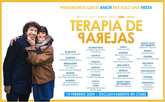 Terapia de parejas es una película de Urresti Producciones, cuyos precedentes Aure retrato y Labordeta, un hombre sin más han estado nominados a los Goya y los Forqué -ganadora de ambos premios la última) y fueron éxitos de taquilla en 2019 y en 2022. Teruel fue uno de los escenarios de rodaje, junto a Tarazona, Zaragoza y México. Cuenta con la colaboración de Aragón TV y el apoyo de los Fondos Fite, subvencionado por Ayuntamiento de Zaragoza y Diputación de Zaragoza y Gobierno de Aragón. Se estrena en salas comerciales en un día siempre marcado en el calendario para los enamorados: 14 de febrero.