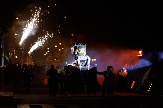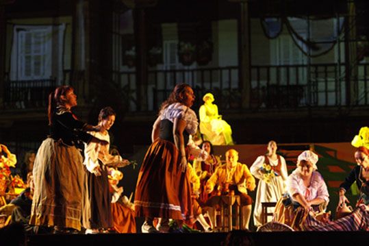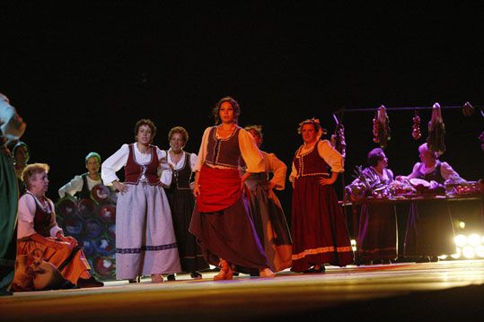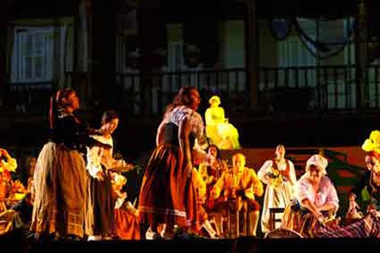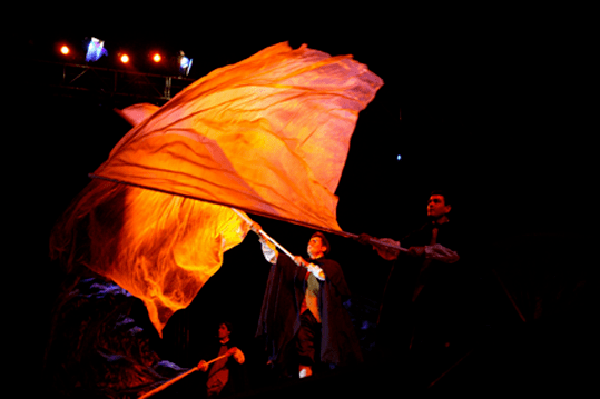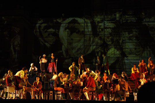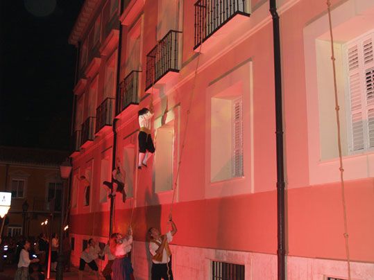 El potente sonido y la música creada expresamente para esta representación, los juegos de luces sobre las fachadas, los vistosos y coloridos trajes de época que llevan los actores, los impactantes diálogos recreados por don Benito, los bailes, las luchas, las acrobacias convierten esta representación del Motín de Aranjuez en un espectáculo total que impacta a los más de 6.000 espectadores que se amontonan en la amplia explanada.