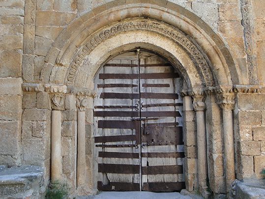 Fue restaurada en estilo gótico, conserva de su etapa románica la portada. Ésta tiene tres arquivoltas ligeramente apuntadas, que se apoyan sobre capiteles decorados con motivos animales. La puerta esta enmarcada por un alfiz. Encima de la portada hay tres vanos cegados, el arco del central es lobulado y sobre ellos un óculo.