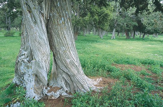 En los llanos de Calatañazor, un mundo centenario crece lento, antiguo y silente. Es allí, al pie de la hermosa villa medieval que recibe con calles empedradas y chimeneas redondas, donde el sabinar que baja de la sierra de Cabrejas encuentra su densidad más impresionante. Incluido en la Red de Espacios Naturales de Castilla y León, este bosque acogedor y longevo contiene una de las escasas masas de sabinas albares (Juniperus thurifera) de porte arbóreo y gran altura. Forma parte, además, del sabinar de páramo más extenso y mejor conservado de la península.