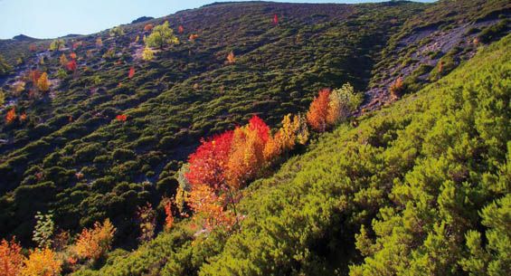 Uno de los mayores atractivos de este hayedo son sus 1390 hayas, de corpulentas y voluminosas formas. A pesar de su altitud y los grandes contrastes climatológicos que debe soportar (sepamos que este árbol necesita suelos frescos y fértiles, sin embargo logra vivir en suelos silíceos. Como tiene una elevada tasa de transpiración, necesita abundante lluvia. Es una especie de sombra y por eso prefiere situarse en las montañas y los montes), con veranos secos, escasos días de niebla y temperaturas muy bajas durante el invierno, que no favorecen la germinación de los hayucos, este bosque mantiene su esplendor y poco a poco se va regenerando e incluso creciendo. Junto al Hayedo podemos encontrar pendientes desnudas de vegetación donde aflora la cuarcita, dando un gran contraste con las áreas cubiertas de árboles y arbustos, hayas, acebos, servales del cazador y robles son algunos de los árboles que podemos encontrar en la zona, dándole una variedad cromática difícil de encontrar en otros lugares.
