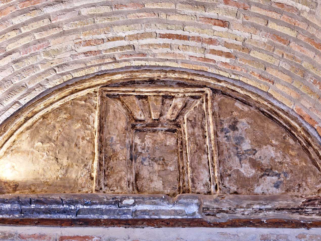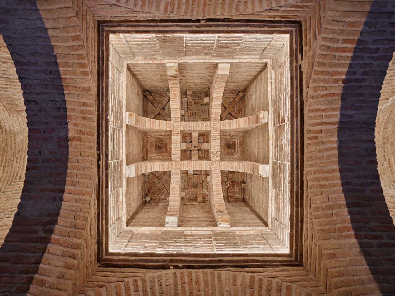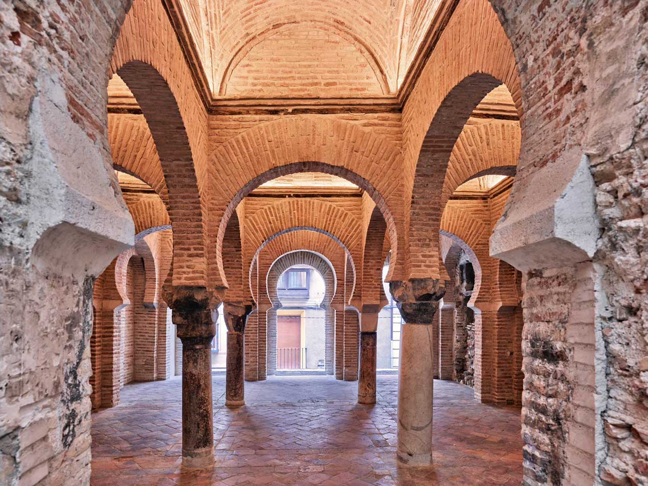 Bóvedas de ladrillo cubren estos espacios, culminando en el centro con una cúpula remarcable, sostenida por dobles arcos que se cruzan sin tocarse. Este recurso arquitectónico, junto con los arcos de herradura y columnas bajas, refleja la maestría del arte islámico peninsular.