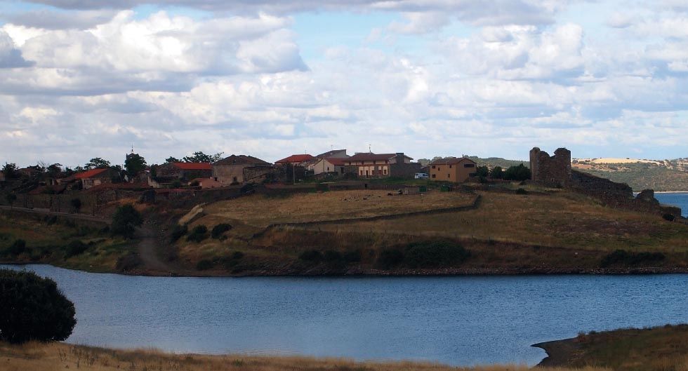 Ceñía la población una muralla de lajas de pizarra (muy abundantes en esa zona), con cuatro puertas, de las que se conserva la del Río hacia Oriente, con arco no anterior al siglo XVI, en lo que parece. A sus pies se hunde un profundo tajo hasta el cauce del río Tormes, que por allí se atravesaba a través de un puente de varios arcos, hechos igualmente de pizarra, cuyos restos tan sólo perseveran debajo de las aguas del pantano que actualmente los cubre, pudiéndose ver tan sólo en años de extrema sequía.