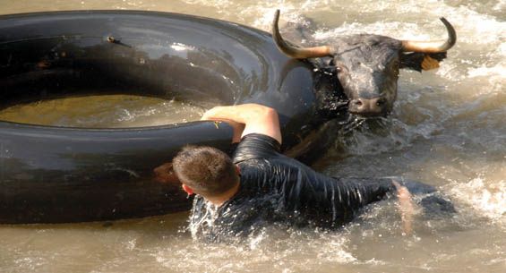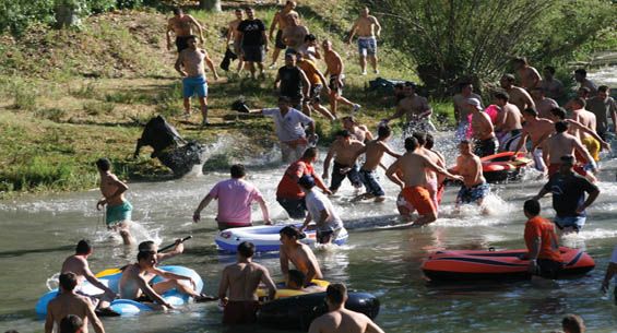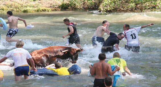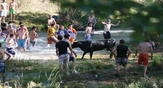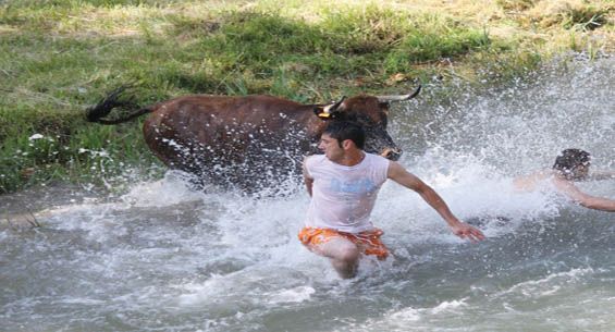En cuanto a la naturaleza del espectáculo, Jorge lo tiene claro: “Es único. El corredor cita al animal en su medio natural. La combinación del divertimento que permite el río y festejo taurino popular llama la atención de muchísimos aficionados al toro, cada vez más, y de lo más florido del recorte provincial y de la rivera del Tajuña, que es la cuna de esta especialidad”. Los recortadores animan y dirigen a la mocedad. Paquito Henche, representante del orgullo local, toma cartas en el asunto y ejerce de anfitrión. Está al quite de lo que pueda pasar, velando siempre por la seguridad e integridad de los participantes. Además, nunca falta un detalle de la clase que atesora. En la Isla, los toreros a cuerpo limpio hacen gala de la misma caballerosidad que tienen en el ruedo y respetan los turnos y momentos de gloria de cada cual en la pelea con las vacas.