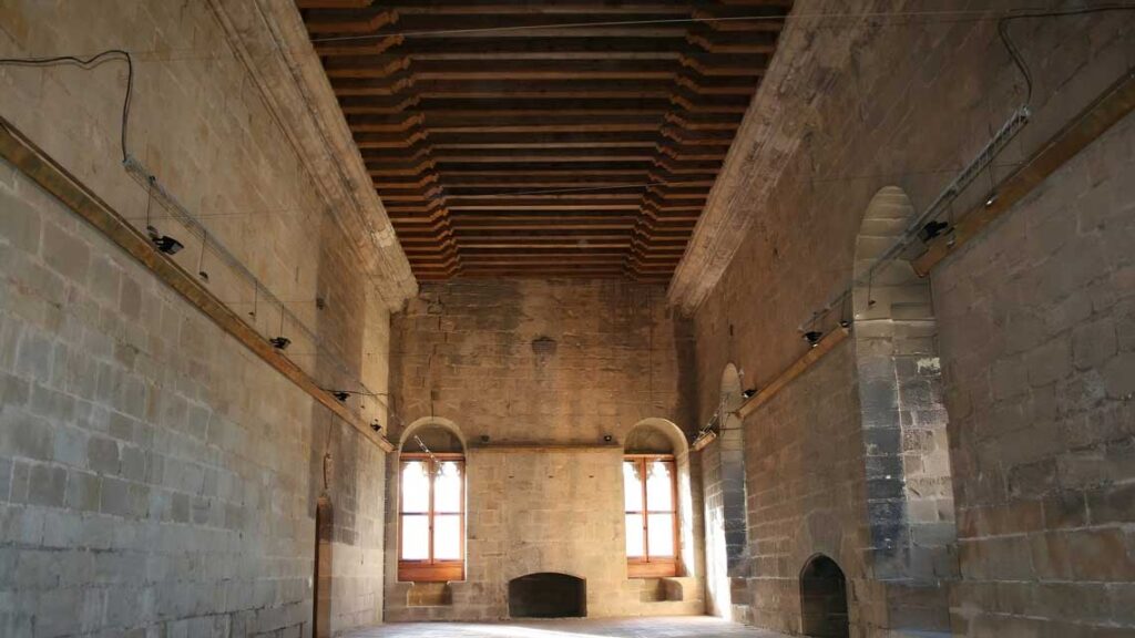 El recorrido por el castillo os llevará a espacios de gran valor histórico, como la Sala Capitular, rodeada por un banco de piedra y utilizada como sala de espera, o el majestuoso Salón de las Chimeneas.