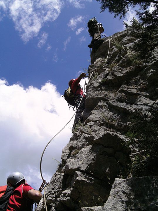 Una Vía Ferrata es un itinerario deportivo situado en una pared rocosa y equipada con elementos específicos (cables, escalones, pasamanos,…) destinados a facilitarnos la progresión y optimizar la seguridad de los usuarios. Se trata de una actividad a caballo entre el senderismo y la escalada, aunque con sus propias características, técnicas, materiales y equipación.