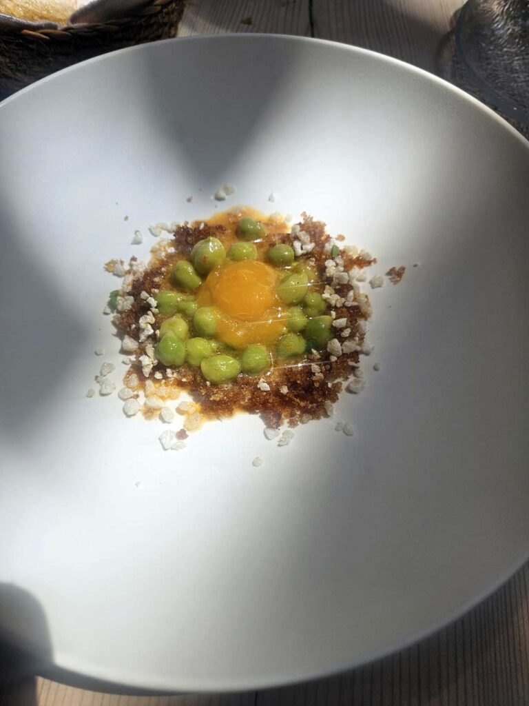 El respeto por la materia prima es evidente en cada plato. El garbanzo verde con yema es un ejemplo perfecto. Un plato aparentemente sencillo que explora las texturas y los sabores de un ingrediente poco habitual en la alta cocina, realzado por la cremosidad de la yema.