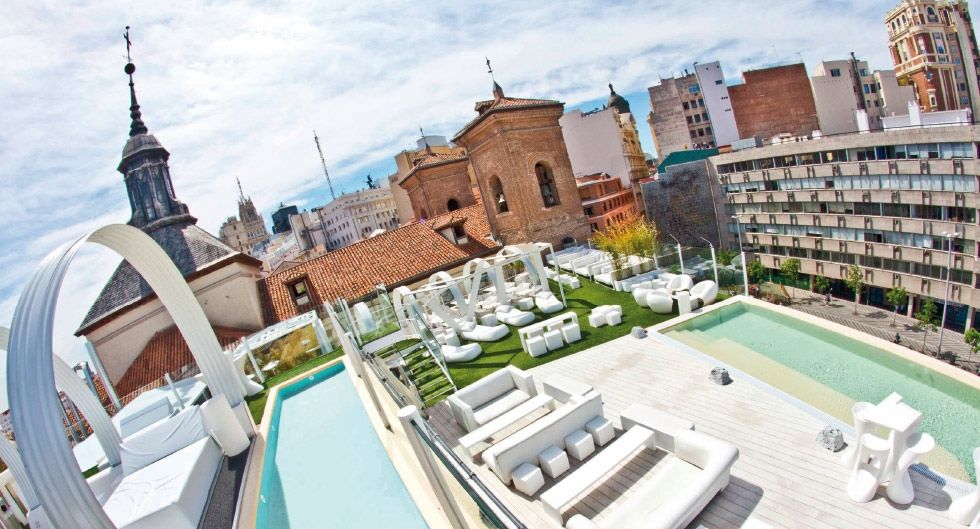 La Terraza con un mobiliario blanco y muy cómodo es un espacio abierto, sin estrecheces, situada en el ático del edificio .En invierno cuenta con un sistema de acristalamiento que permite al público cenar y tomar copas bajo la lluvia. Y en verano, disfrutar de una puesta de sol única en Madrid con un Mojito en la mano.
