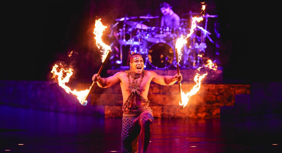 Todos los números son increíbles, pero destacamos «bastones en llamas» donde un temerario no solo se limita a jugar con el fuego, él es fuego. Come, respira y toca las llamas mientras hace girar sus cuchillos.