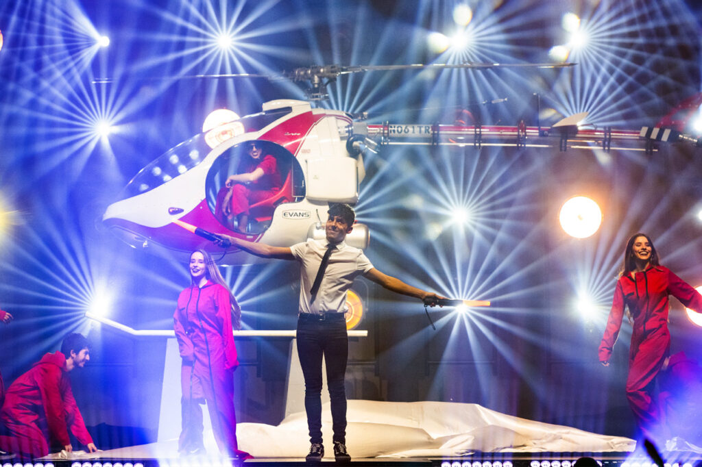 Uno de los momentos más impresionantes del espectáculo es un truco en el que el Mago Pop aparentemente desaparece y se teletransporta ante los ojos del público. En un parpadeo, se desmaterializa en el escenario, solo para aparecer en un lugar completamente diferente, sobrevolando la audiencia en una plataforma flotante, sin ningún tipo de artilugio o truco visible.