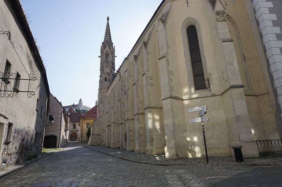 Fácilmente reconocible es también La Catedral de San Martín, ya que en la punta de su torre, en vez de una cruz, como suele ser lo habitual, hay una réplica de la Corona de San Esteban (la Santa Corona Húngara). El motivo es que en esta basílica se coronaron los monarcas del Reino de Hungría entre 1563 y 1830 siendo el primero Maximiliano II de Habsburgo en 1563. En total fueron coronados en la catedral, once reyes y ocho reinas. Las coronaciones contaban con un estricto protocolo y con interminables fiestas que hoy en día evocan las incrustaciones en forma de pequeñas coronas de latón que podemos ver en los adoquines de algunas calles peatonales indicando el “camino a la coronación”.