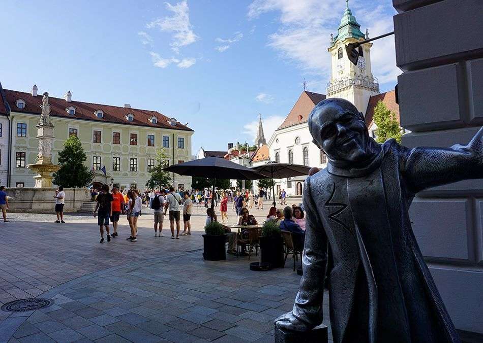 Otro de los atractivos de la ciudad son las originales estatuas de bronce repartidas por el centro histórico. Entre las más famosas, el Čumil, que representa a un trabajador saliendo de una alcantarilla. Curiosamente está señalada con un poste para no tropezar o ser atropellada por un vehículo. Se dice que si tocas su casco te dará suerte. Otra es el Schöne Náci inspirado en un personaje real de principios del siglo XX, Ignác Lamár, del que se cuenta que su mujer lo abandonó, enloqueciendo y saludando desde entonces por las calles con sombrero de copa y frac. Si te colocas bajo su sombrero, ten por seguro que volverás a Bratislava.