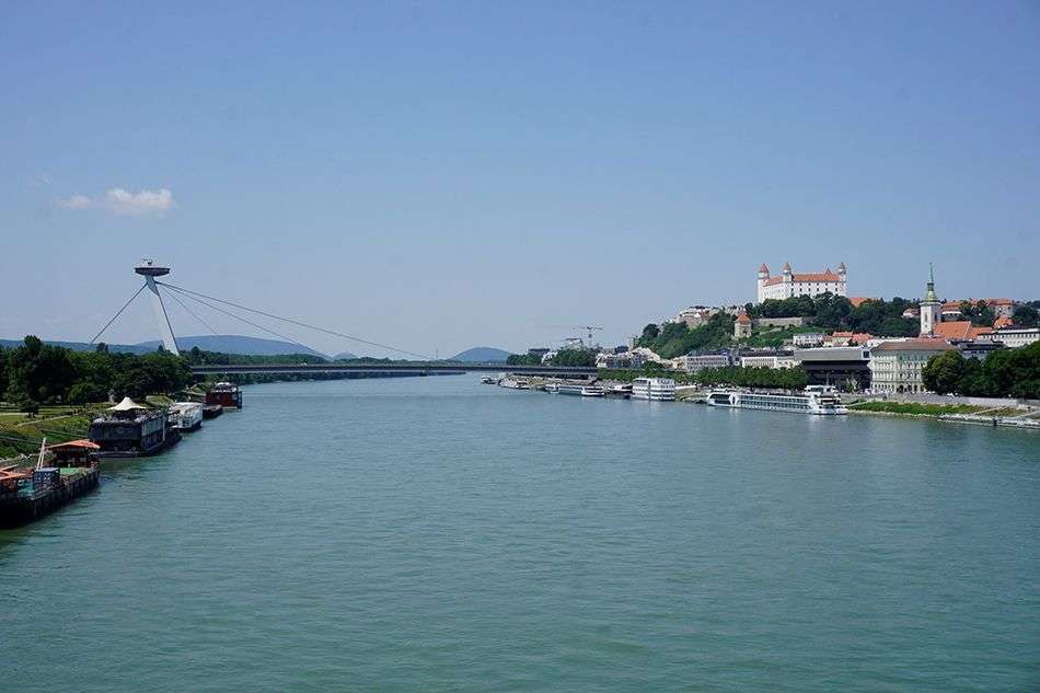 Cruzamos al otro lado del Danubio atravesando el Puente Viejo -que también dispone de carril bici- y en el que hay instalados varios miradores donde recrearse destapando unas de las mejores estampas de Bratislava, con el Danubio, el Castillo, la Catedral y el llamado UFO.