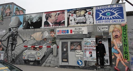 Check point Charlie. La denominación “Charlie” viene del alfabeto fonético (c) Después de la construcción del muro era el lugar donde podían pasar a las dos Alemanias. Hay una exposición fotográfica amplia así como un museo (Mauermuseum) digno de ver como la gente se las ingeniaba para pasar de un lado a otro del muro.