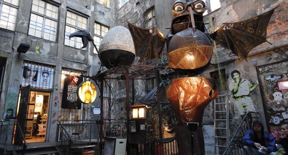 Es necesario perderse por el barrio judío te sorprenderá y te impactará el Edificio Tacheles. Calle Oranienburger (centro cultural alternativo más famoso de la ciudad) donde se puede disfrutar de originales exposiciones e improvisados talleres de excéntricos artistas, que trabajan y exponen sus obras para venderlas al aire libre. En las cinco plantas se puede encontrar algunos bares con gente variopinta. Al igual que un extravagante taller de esculturas de hierro y acero, donde se puede ver al artista trabajando en sus proyectos, algunas de ellas de una gran dimensión que incluso te asustan. Para que este centro no fuera demolido, los artistas lo ocuparon, evitando así su destrucción. Con los años y como consecuencia de la negativa a no pagar y el abuso de que las salas se estén alquilando a nuevos creadores, es un espacio que tiene sus días contados.