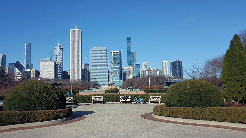 El tiempo nos acompañaba y alquilamos de nuevo las Divvy Bikes sin saber que sería todo un acierto. Nos dejamos llevar pedaleando bajo un brillante cielo azul por los senderos de Grant Park descubriendo plazuelas, jardines y verdes rincones que contrastan con la altura de los edificios que nos rodean. Desconocemos si está prohibido circular en bicicleta dentro del parque, pero apenas encontramos a nadie, recreándonos de nuevo en esta fabulosa y tranquila parte de Chicago.