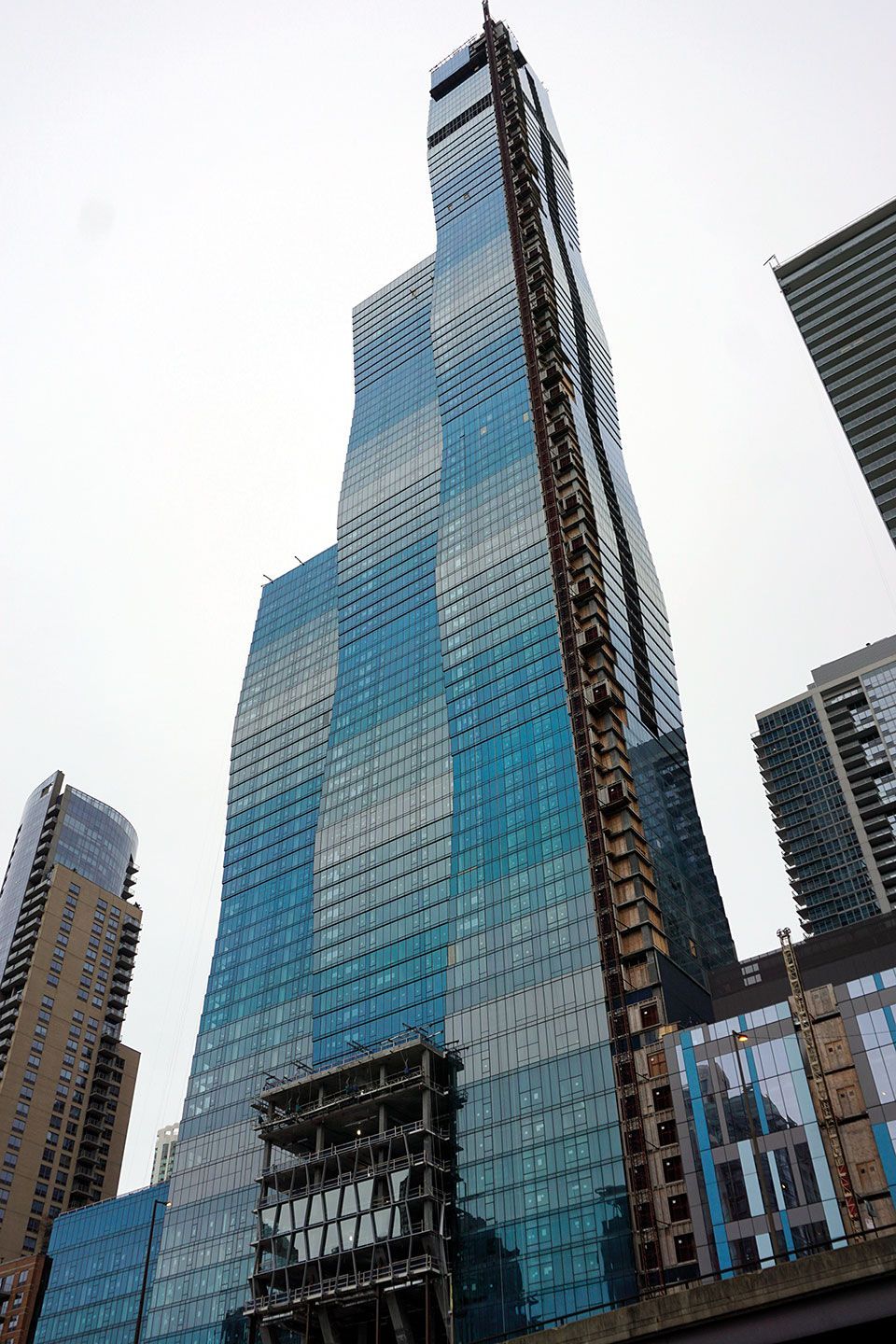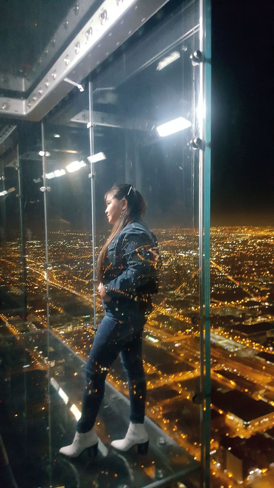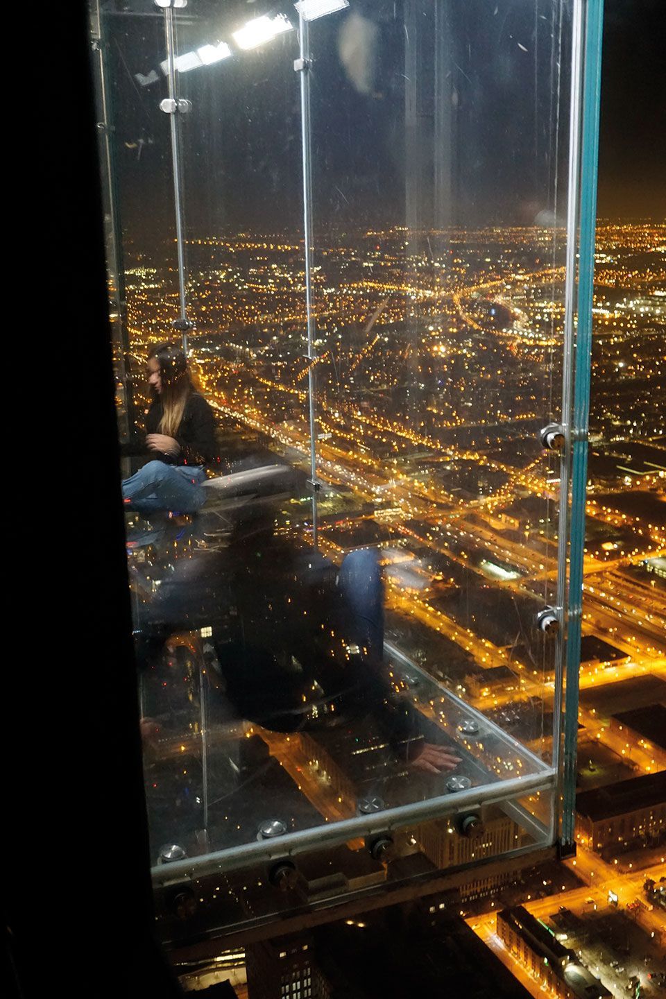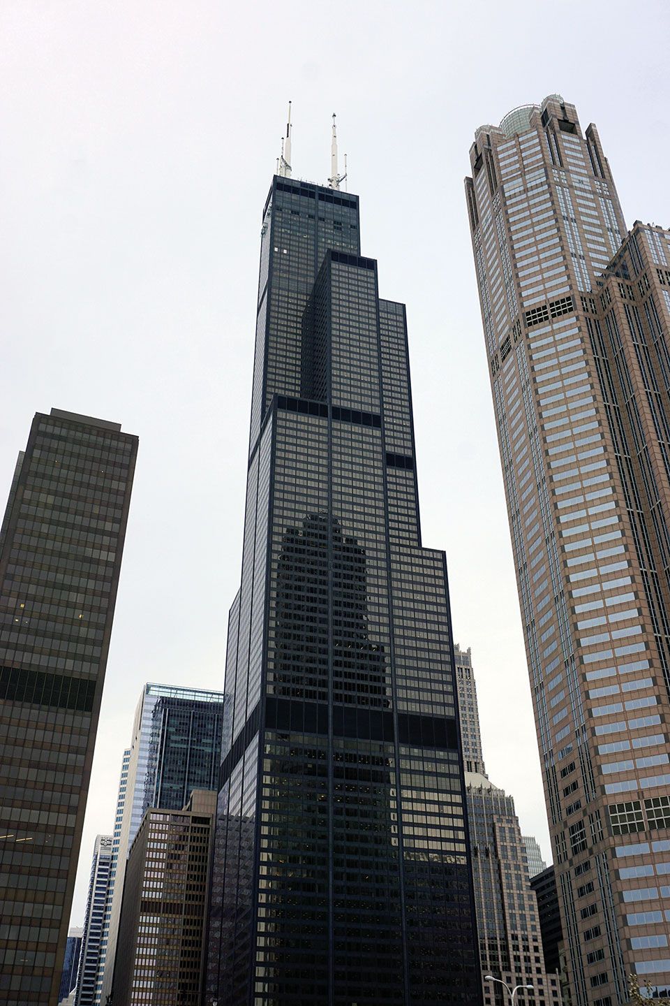 Al terminar, nos dirigimos al distrito financiero de Chicago, donde se levanta la famosa Torre Willis, (originariamente Torre Sears), un moderno y atractivo edificio de oficinas. Su construcción se inició en agosto de 1970 y durante casi 20 años defendió el récord de edificio más alto del mundo. Actualmente, el mirador situado en la planta 103 Skydeck, es una visita obligatoria y una atracción turística de la ciudad. De vastos ventanales, esta plataforma de observación resulta innovadora con balcones de cristal que permiten vistas en todas direcciones, dando la sensación de estar suspendido en el aire. Para entrar al hueco acristalado encontramos una larga cola de aproximadamente unas dos horas. Como es de comprender, nos quedamos sin la tan popular fotografía, pero disfrutamos igualmente de las imponentes vistas del anochecer que nos ofrece el resto del recinto. Quizá el encendido de las luces de la ciudad al atardecer, es el elegido por la mayoría, y un mal momento debido a la gran afluencia de público. Un dato a tener en cuenta si no quieres perder dos preciadas horas esperando tu turno.