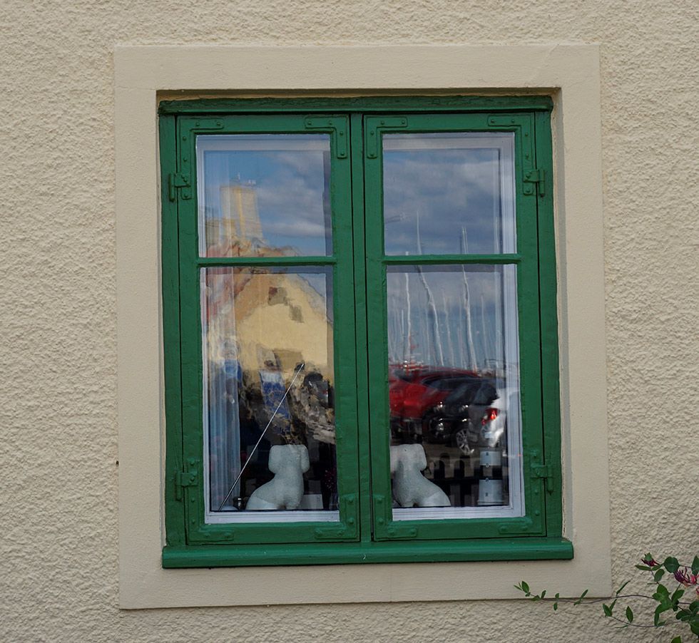 Volvimos al puerto, candamos las bicis, y nos adentramos por las estrechas callejuelas de casitas amarillas, tejados de paja y flores en las ventanas, que nos recuerdan a la de Blancanieves. Es encantador. En una ventana vimos, ¡!por fin!!, los famosos perritos cuyo significado os hemos contado previamente y de los que os dejamos una foto.