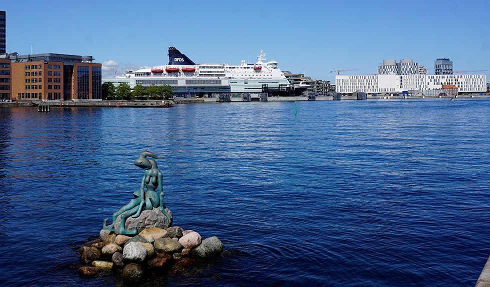 Continuamos hacia el norte pedaleando por el paseo marítimo Langelinie, desviándonos a un solitario canal con el fin de encontrar a la hermana de “La Sirenita”, la llamada “Sirenita Genéticamente Modificada”. Rodeada de flamantes edificios de apartamentos, figura esta versión de arte moderno, que, aunque menos conocida, nos entusiasmó. En las inmediaciones, una pareja nadaba en las frías aguas.