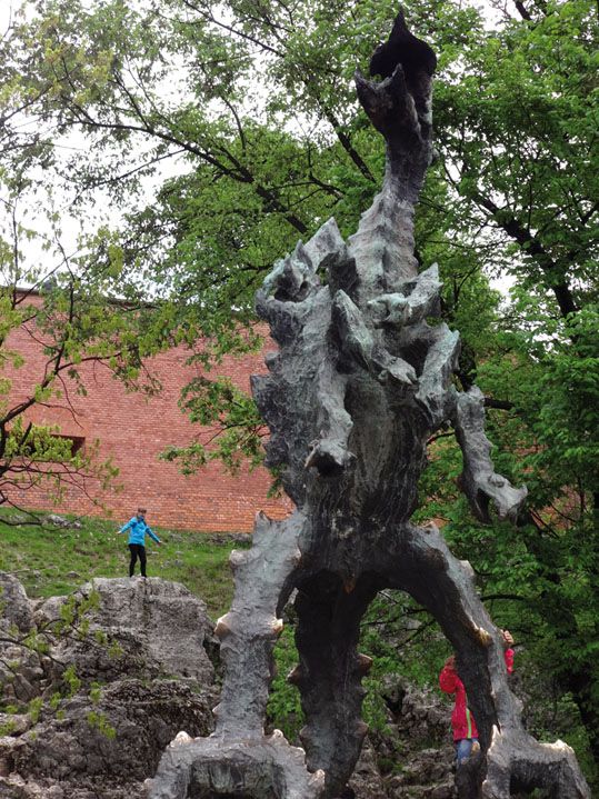 Al bajar hacia el borde del río podremos ver también la estatua del el Dragón de Wawel y la entrada a su cueva. Hay una conocida leyenda que cuenta que se estableció un asentamiento en esta colina sobre una cueva ocupada por un Dragón al que numerosos caballeros trataron de matar, hasta que un listo zapatero le dio una oveja que rellenó de azufre; el dragón se la comió y se bebió el agua del río Vístula hasta estallar. Al pié de la cueva se puede ver la estatua del dragón que echa fuego cada varios minutos y que hace las delicias de los más pequeños.