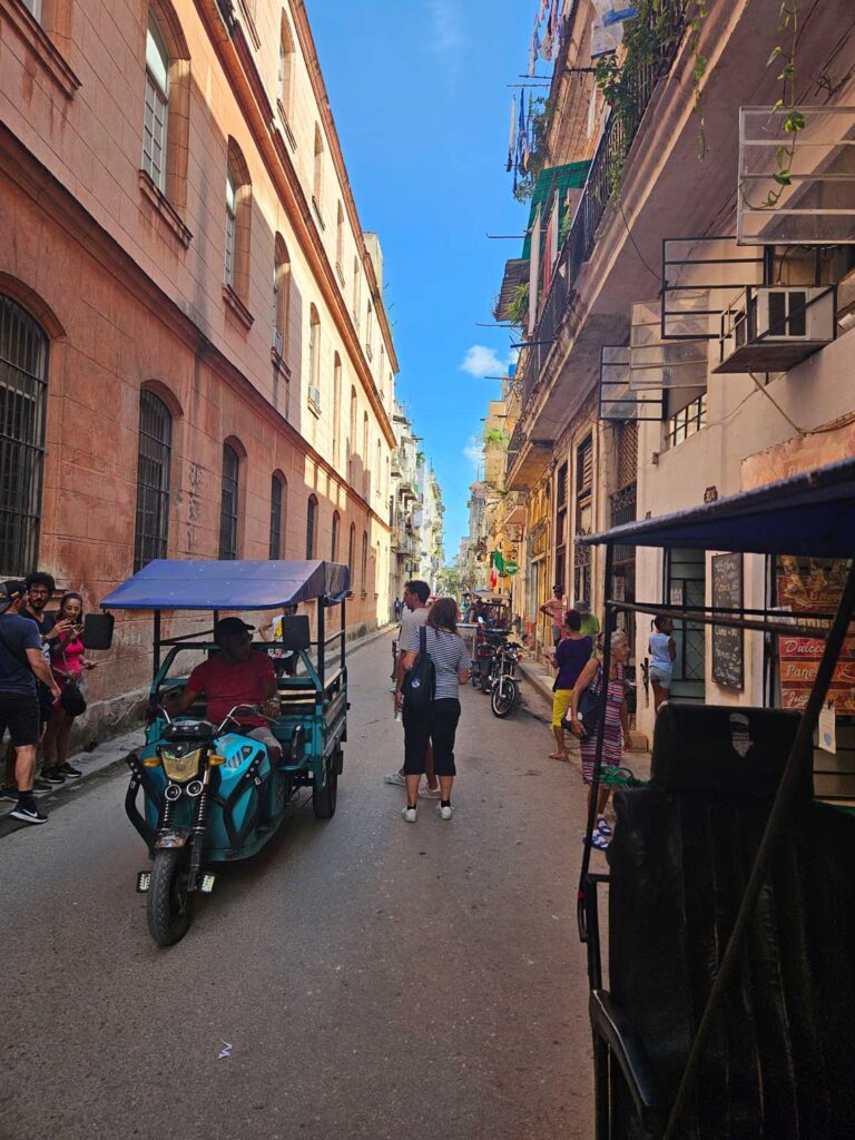 Hicimos una pausa para tomar un café servido desde la clásica ventana enrejada, tan característica de La Habana. Mientras lo disfrutábamos, observábamos a las mujeres asomadas en los balcones de sus casas: algunas conversaban animadamente, otras simplemente contemplaban el ir y venir de la vida callejera. En las angostas calles, los coloridos carritos de fruta aportaban movimiento al paisaje urbano. Nos llamó la atención la presencia constante de estas rejas en puertas y ventanas, una solución ingeniosa que permite que el aire fluya libremente sin renunciar a la seguridad.