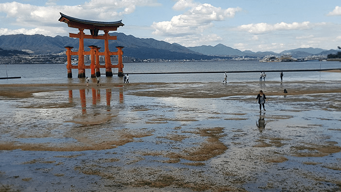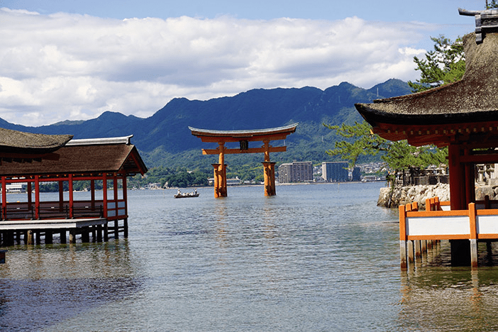 Conocida popularmente como Miyajima, Itsukushima es una isla ubicada dentro de la Bahía de Hiroshima. Siempre ha sido un lugar sagrado, pues en el año 593 se estableció allí el célebre Santuario de Itsukushima, que se halla a unos 12 minutos desde la terminal del ferry. Este Santuario, Patrimonio de la Humanidad, y su gran torii son símbolo de la isla. El santuario mantiene el estilo arquitectónico Shinden, típico del periodo Heian de la historia japonesa (de los años 794 a 1185) y se compone de un templo principal y varios secundarios que se están conectados por puentes y galerías. Lo que le hace bello es que está parcialmente construido sobre el agua, ya que está dedicado a la diosa guardiana de los mares. El grandioso torii bermellón, es la entrada al santuario que se encuentra a unos 200 metros. Con la marea alta parece flotar sobre las aguas. Es posible acceder a su base, a pie, cuando baja la marea. Es algo fantástico y un lugar inolvidable, en especial con la luz del atardecer.