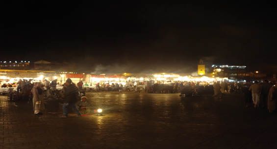 En la Plaza Jamaa el Fna por la noche, se puede optar por cenar en los puestos de comida. Los precios son baratos y para los arriesgados es la mejor manera de integrase en el ambiente de la Plaza. Nosotros, siendo un poco alarmistas, no lo aconsejamos mas que nada por evitar el riesgo de pasar los días sucesivos con algún problema estomacal.