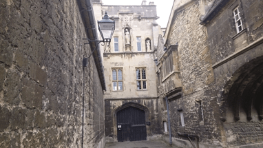 Paseando nos topamos con las impresionantes fachadas de entrada a los centros estudiantiles. Enormes portones de madera con el escudo de cada institución dan acceso a amplísimos patios centrales de hierba bien cuidada rodeados de muros de piedra por donde trepa la hiedra que ofrecen un aspecto misterioso y místico. Amplias escalinatas se bifurcan en la entrada a los soportales. No es de extrañar que estos escenarios fueran la inspiración de películas tales como “Harry Potter”.