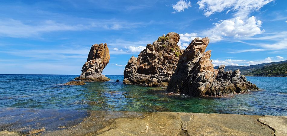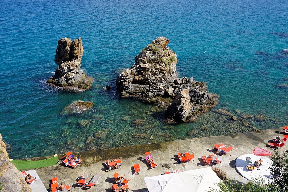 Salimos de Taormina temprano. Nuestro nuevo destino situado en el noreste de Sicilia era el pintoresco pueblo de Cefalú, a 213 Km. La autovía cercana a la costa resultó bastante entretenida. Nos llevó casi tres horas llegar al Hotel Kalura, donde nos alojaríamos las dos noches siguientes. Lo elegimos por la idílica cala que atesora, puesto que se halla sobre un acantilado. La multitud de escaleras para bajar a la pequeña playa están situadas en la verticalidad de un espectacular barranco, ofreciendo extraordinarias vistas sobre el mar, del que surgen escultóricos peñones entre aguas cristalinas. Se encuentra a dos kilómetros y medio del centro de Cefalú.
