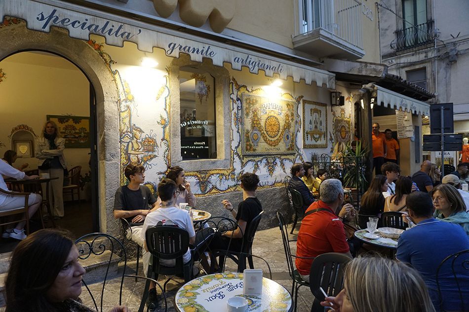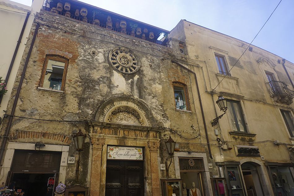 Después de disfrutar enormemente de la gastronomía local, caminamos entre las edificaciones medievales. Los faroles de forja nos introducen en un ambiente histórico. En las estrechas callejuelas que parten de la vía principal hay coloridas exposiciones de pintura y artesanía sobre antiguos muros. Las trattorias ofrecen áticos abiertos de cálida luz. También los escaparates de pastelerías y heladerías nos presentan sus exquisitas creaciones. Aconsejaros de nuevo el helado de “pistacho de Bronte” de indiscutible sabor y rey de la gastronomía siciliana.