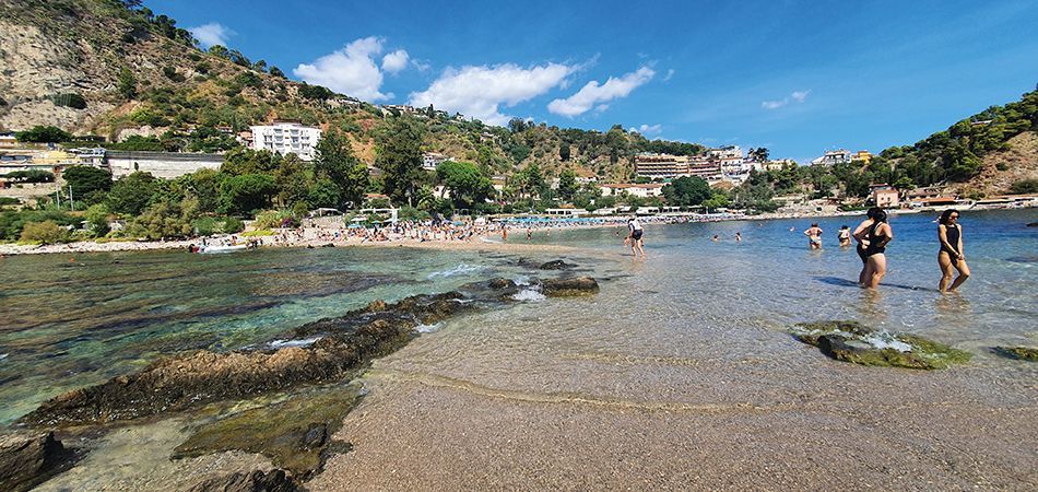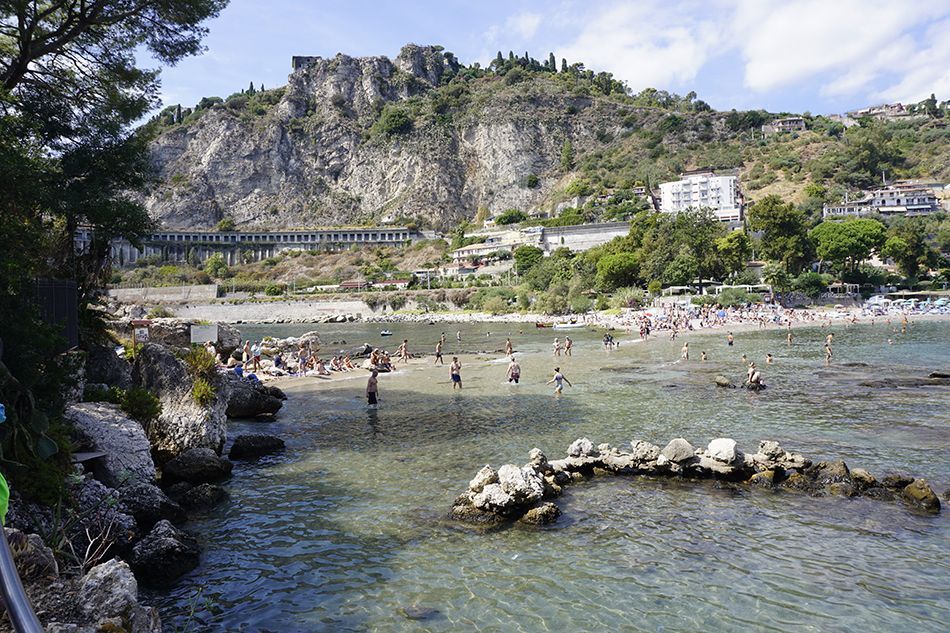 Con un espléndido sol, el día siguiente lo dedicamos al mar. Lo primero que hicimos es darnos un baño en la calita de aguas cristalinas de la Bahía de Mazzaró. Algunas tumbonas pertenecientes a los hoteles se habían desplegado en la arena desde primera hora, pero no encontraos a penas gente. Finales de septiembre, es en definitiva una buena elección para visitar Sicilia. Tras el placentero baño, a tan solo un kilómetro, caminamos hasta Isola Bella, otro de los tesoros de Taormina.