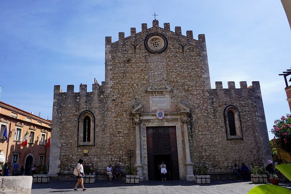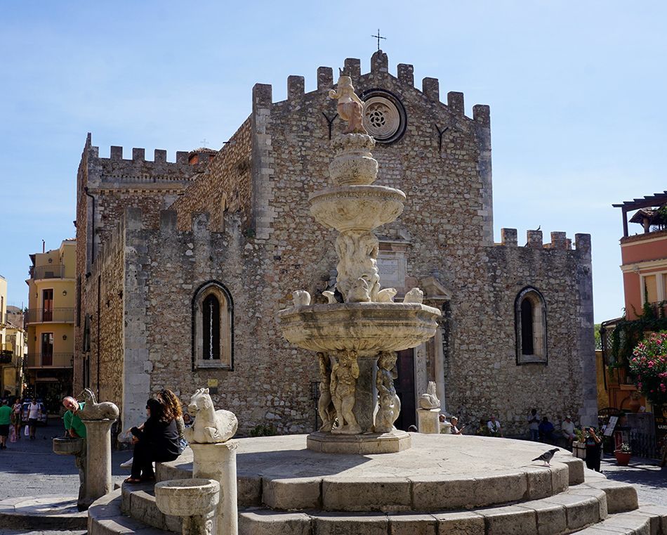 Poco después, alcanzamos la Plaza del Duomo, una pequeña y bonita plaza presidida por una fuente escultórica. El Duomo de Taormina o Iglesia de San Nicolò, fue construida en el s.XIII sobre una antigua iglesia medieval dedicada a San Nicola di Bari. El Duomo también es conocido como la Catedral-Fortaleza, algo que se entiende dada su arquitectura.