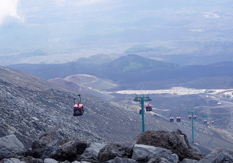 A la llegada al Refugio Sapienza, se abre una gran explanada con aparcamiento, donde se han instalado tiendas de alquiler de equipos de montaña, información y excursiones, bares, restaurantes y tiendas de souvenirs. Es, desde este punto, desde donde parte un funicular que alcanza la cota de 2500 metros y cuyas cabinas vemos ascender lentamente montaña arriba. Desde los 2.500 a 2.750 metros hay que ir acompañado de guías o vulcanólogos, estando completamente prohibido superar esta cota. El coste total de la excursión era de 65 euros. Donde termina el teleférico, los guías te acompañan en algunos todoterrenos y hay que caminar unos 20 minutos. La otra opción es subir solo el teleférico, lo cuesta 35 euros. Conviene saber que las temperaturas son bajas, por lo que es imprescindible llevar ropa de invierno, aunque hay tiendas de alquiler de guantes, calzado y anoraks.