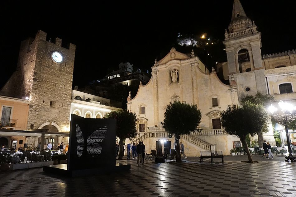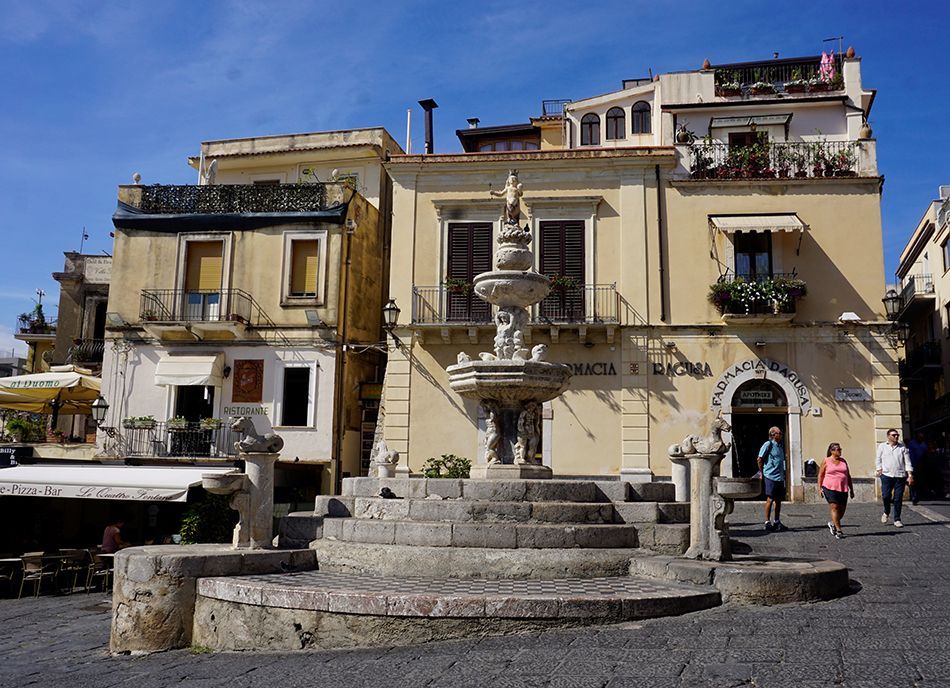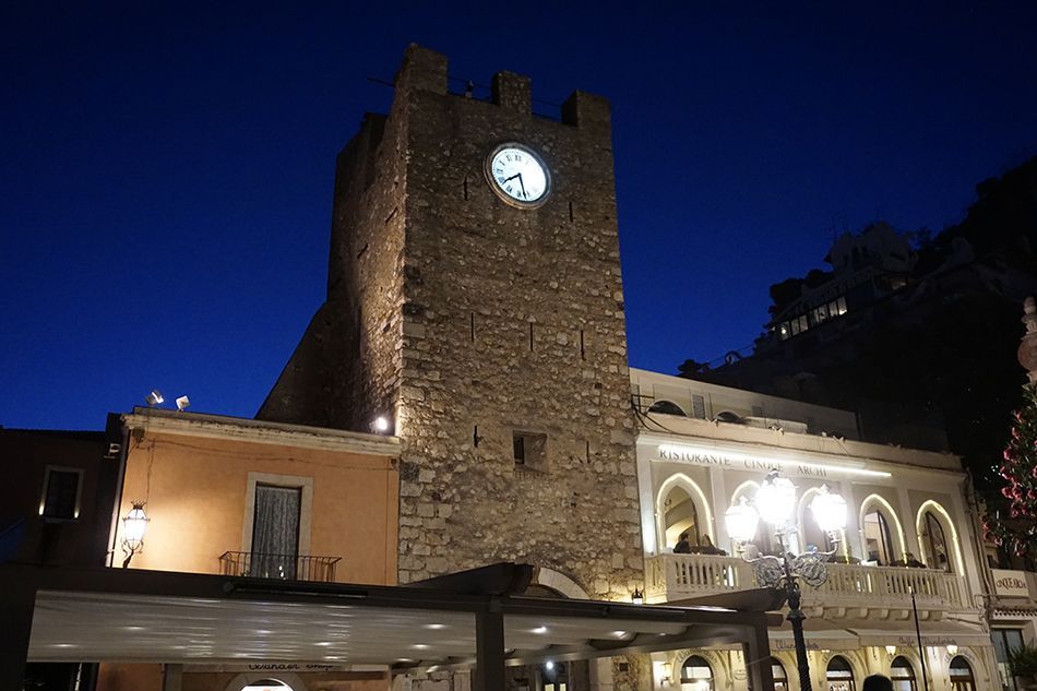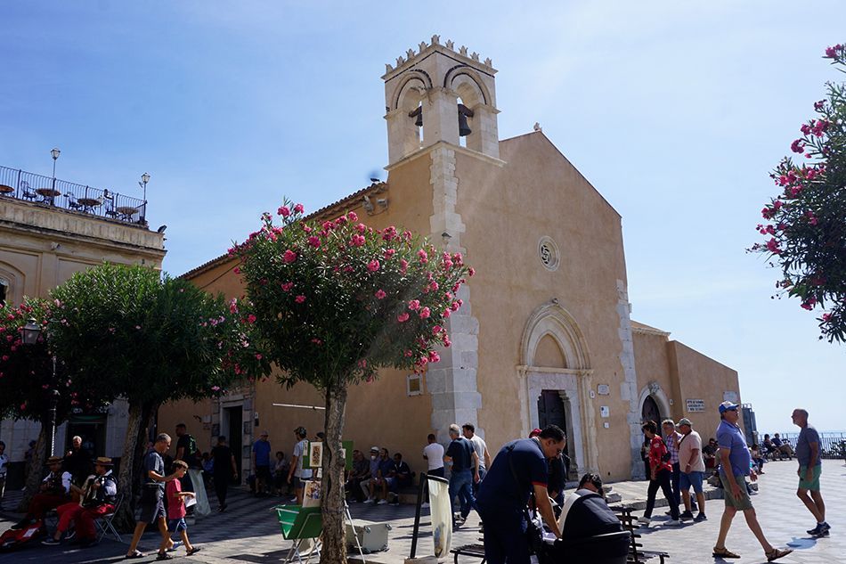 Llegamos la majestuosa Piazza IX Aprile, donde se abre un gran y espectacular mirador sobre el mar y el Monte Etna. Esta amplia balconada se halla rodeada de admirables edificios como la “Torre del Reloj” o “Puerta del Medio”, símbolo histórico de Taormina, la antigua Iglesia de San Agostino que data de 1486 y sobre una escalinata, la Iglesia de San Giussepe de estilo barroco.
