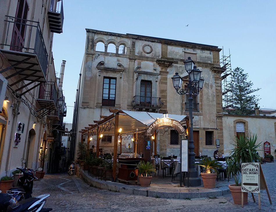 En la misma plaza, cenamos en la terracita del recomendable restaurante llamado “Al Duomo” situada en el primer piso, con vistas a la catedral. Degustamos unos sabrosos espaguetis con almejas (a Vóngole), una fresca ensalada de pulpo a la siciliana, y rematamos con un delicioso tiramisú. Como curiosidad y al pedir algo más de peperonchino (chile picante) para la pasta, nos preguntaron si podían cogerlo de una de las macetas que adornaban el balcón. Allí mismo en la mesa lo limpiaron y cortaron en finas láminas, un toque de naturalidad y gracia que nos encantó. El vino, Nero d’Avola, fue todo un descubrimiento. Se obtiene de las uvas de una variedad autóctona. El acceso al restaurante se encuentra por unas escaleras en un lateral de la plaza.