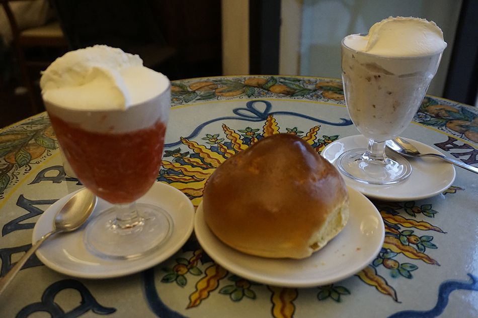 Hicimos una pausa en la célebre cafetería Bam Bar para probar su granita siciliana. La granita es una especie de crema semi congelada, de textura más suave que un granizado y menos denso que el helado. Los sicilianos lo acompañan de un brioche que untan en la deliciosa tiene crema. La hay de muchos sabores. Elegimos el de almendras y pistacho cuyo sabor es extraordinario. En algunos hoteles la presentan también en el desayuno.