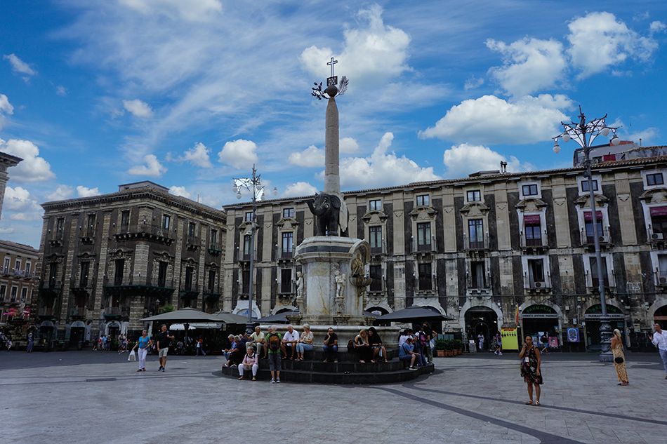 A unos 150 metros de la Piazza dell’ Universitá, se encuentra la Piazza del Duomo, el corazón de Catania. Es uno de los lugares más fotografiados en la que destaca la imponente fachada de la Catedral de Catania o Catedral de Santa Ágata, en cuya capilla se encuentra el cuerpo de la venerada Santa y en el que se halla enterrado el gran compositor catanés Vincenzo Bellini. Es obra de Giovanni Batista Vaccarini 1736, arquitecto encargado de muchas de las obras más reconocidas de la ciudad. En el centro de la plaza se halla uno de los símbolos de Catania, la Fuente del Elefante. Sobre la escultura de un elefante de roca lávica símbolo de la derrota de los cartagineses que llegaron sobre elefantes para conquistar la isla, se alza un obelisco egipcio, traído probablemente en la época de las cruzadas. Corona el monumento una cruz, la palma, y el orbe, representando la cristiandad junto a la insignia de Santa Ágata. Resulta una curiosa composición.