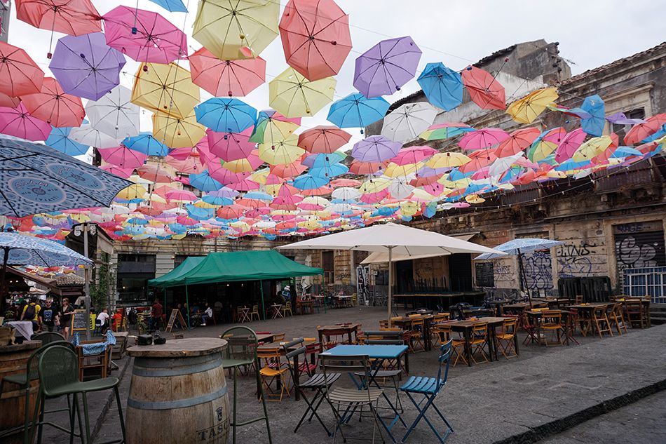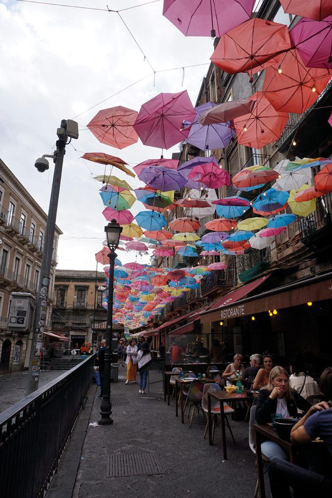 Rodeándola, una escalera de roca volcánica conduce al célebre Mercado de Pescado o “Pescheria”, una de las visitas más pintorescas. Se trata de un mercado histórico al aire libre, muy bullicioso, de puestos con sombrillas, en los que principalmente se expone el pescado del día y marisco fresco. Está ubicado en una curiosa plazuela y los puestos continúan bajo un arco por el que se escucha el vocerío de los vendedores ofreciendo la mercancía. Es un sitio muy auténtico. Recientemente han abierto un establecimiento con mesas para degustar pescado frito que sirven en cucuruchos de papel. Sobre la calle han colocado miles de paraguas de colores para protegerla del sol. Desembocamos en una plaza que se halla también cubierta en la que se disponen sillas y mesas un tanto destartaladas. Los paraguas resultan muy vistosos ofreciendo una imagen divertida e instagrameable.