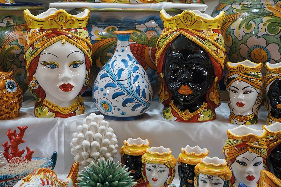 Por último encontraremos por toda Sicilia una numerosa producción de cerámica característica de la isla. Con influencia griega, bizantina normanda y árabe, su máximo exponente, se presenta en un decorado jarrón en forma de cabeza de un moro. Es la famosa Testa di Moro, que se halla por todos lados adornando porches y balcones. Este tipo de artesanía encierra una historia de amor un tanto macabra que forma parte de la tradición popular siciliana.