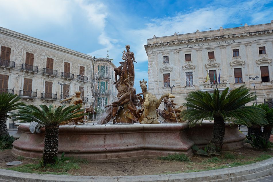 Nos internamos por las estrechas calles en la que se alinean edificios de color miel con balcones de flores, atrayentes tiendecitas y restaurantes. Situada en el centro de la Piazza Archimede se halla la sublime Fontana di Diana, una fuente escultural que plasma una escena mitológica: Diana en el momento en el que transforma a la ninfa Aretusa en agua (una leyenda que os contamos unas líneas más abajo). Es realmente un espectáculo de agua y figuras de las que estuvimos recreándonos un buen rato y disfrutando además del conjunto de edificios que la rodean. En el lateral, el Museo Arkimedeion, dedicado a Arquímedes, muestra las invenciones, descubrimientos y nociones del conocido matemático y físico griego que vivió en Siracusa entre 287 y 212 AC.