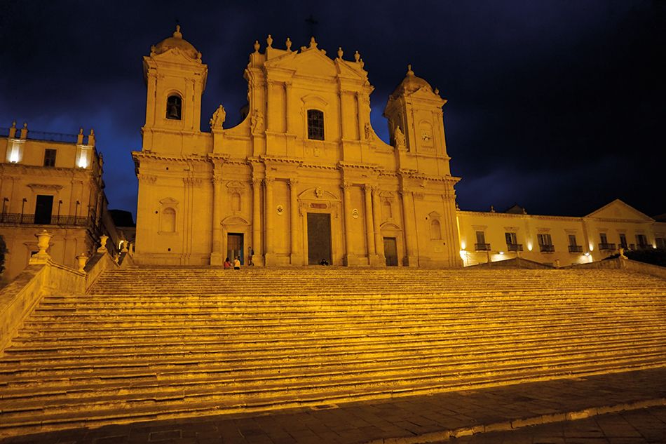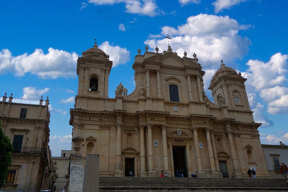 El Duomo al estar erigido sobre un templo de la Grecia clásica se le llama también Templo de Minerva (para los romanos) o Templo de Atenea (para los griegos). Fue reconstruido y transformado en catedral (1728-1753) tras el terremoto del año 1693. Nos parece una auténtica obra de arte con una fachada de mármol y granito. Todo un espectáculo visual que presenta una mezcla de estilos de distintas épocas. Bien merece una visita al interior, para contemplar, entre otros, sus inesperadas y desconcertantes columnas jónicas y vidrieras.
