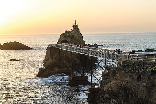 La Roca de la Virgen, “Rocher de la Vierge”, la guardiana de los pescadores. Antiguamente la roca conectaba con la costa a través de un puente de madera que fue reemplazado por una magnífica pasarela de hierro diseñada por Gustave Eiffel. Cuenta la leyenda que a un barco que regresaba al muelle, le sorprendió una feroz tormenta que le impedía llegar al puerto, cuando, de repente apareció un rayo de luz que lo condujo a tierra firme. Como agradecimiento, se colocó la estatua de la Virgen en 1865. Este lugar es un lugar emblemático por excelencia, tanto como el Hotel du Palais, y un lugar para visitar por su historia y porque además, desde lo alto de la roca se puede disfrutar de una de las mejores vistas de Biarritz.
