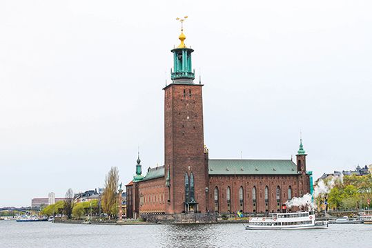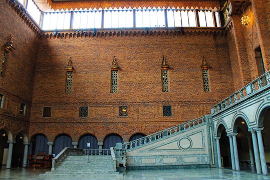 Y por ultimo una de las edificaciones más emblemáticas y apuestas de Estocolmo, El Ayuntamiento. Construida de ladrillos rojos y a orillas del lago, es aquí donde tiene lugar cada año la célebre cena y el baile el día de la entrega de los Premios Nobel. Su torre rematada con tres coronas, símbolo de sueco, se sitúa frente a la costa. Recomendamos subir a la torre por ascensor o para los más activos por una escalera de 365 peldaños para observar lo que para nosotros supuso la mejor vista de la ciudad. Hay que tener en cuenta que dejan pasar a 30 personas cada 40 min. y esta abierto de 9.15 a 15.30. Cuesta 50 coronas pero realmente merece la pena. Compra el ticket y si tienes que esperar descubre los alrededores que bien merecen un paseo. Su visita a su interior es también muy recomendada. En su sorprendente Sala Azul, en la que como curiosidad este color no figura, se celebra el banquete después de la ceremonia de entrega de los Premios Nobel. Y la joya de Estocolmo, El Salón Dorado, que contiene 18 millones de pequeñas piezas de oro.